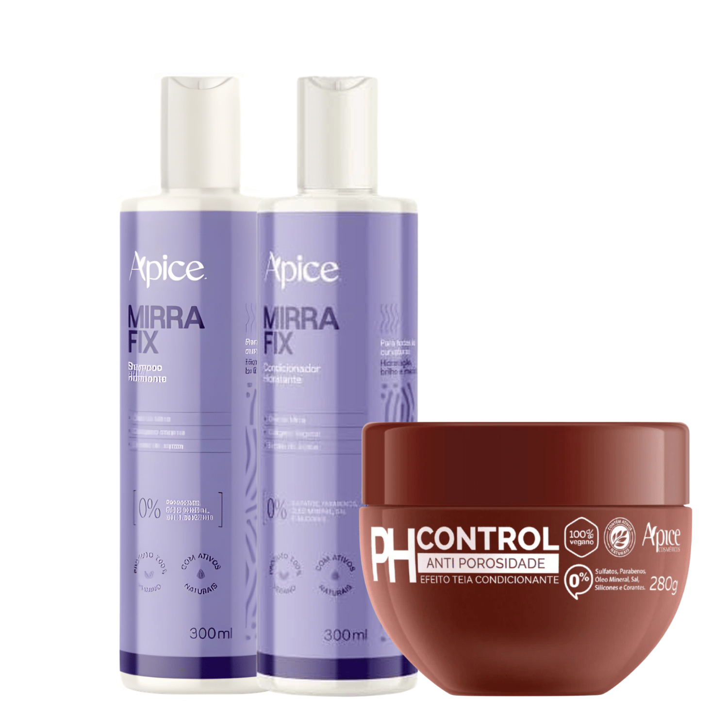 O Trio Mirra Fix + Acidificante Ph Control da Apice Cosméticos combina o poder hidratante e fortalecedor da linha Mirra Fix com a ação restauradora do Ph Control, promovendo um cuidado profundo que trata, sela e protege a fibra capilar desde a primeira aplicação.