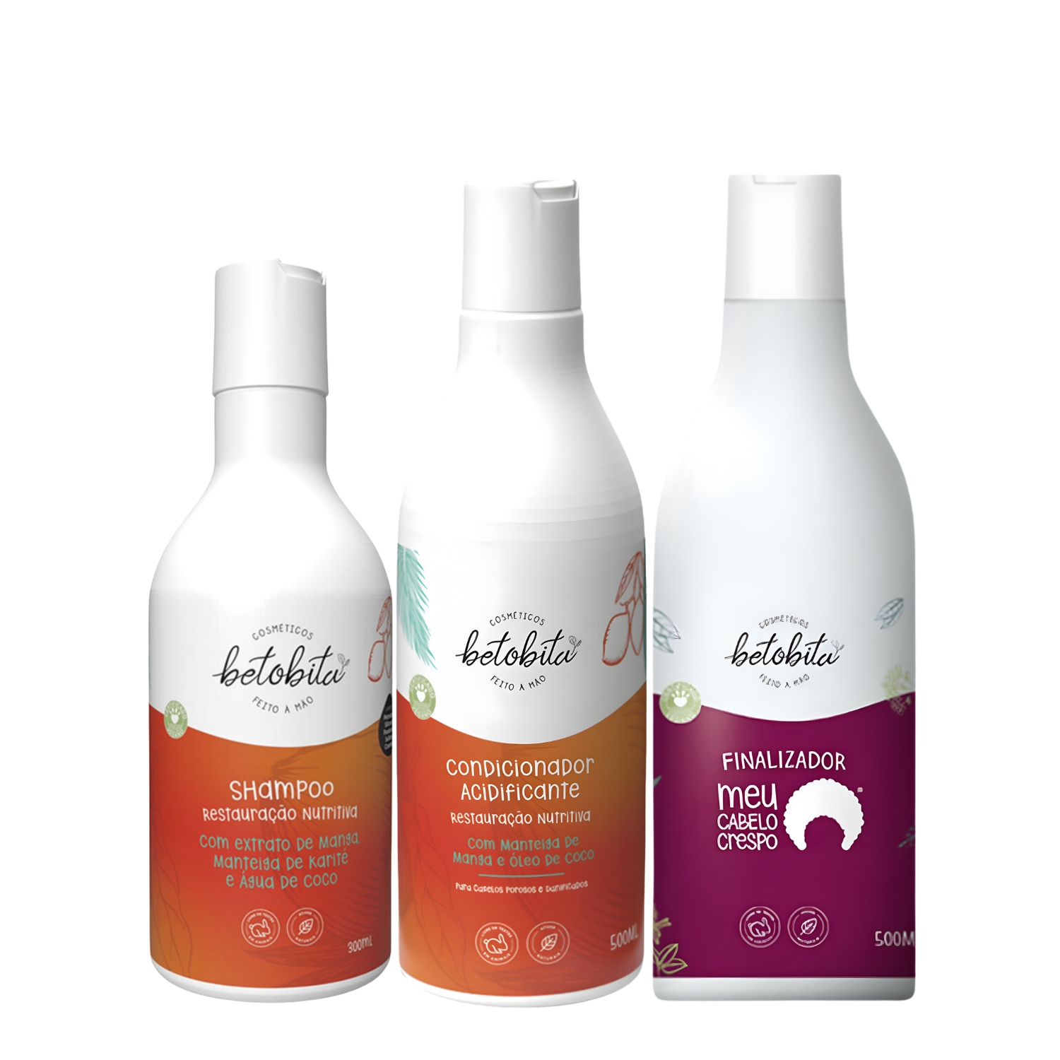 O Kit BetoBita oferece cuidado completo para cabelos tipo 4, da lavagem à finalização. Com fórmula rica em manteigas e óleos vegetais, proporciona hidratação intensa, nutrição profunda, definição e brilho natural, combatendo o ressecamento e promovendo crespos saudáveis, macios e modelados. Ideal para quem busca finalização poderosa e day after prolongado.