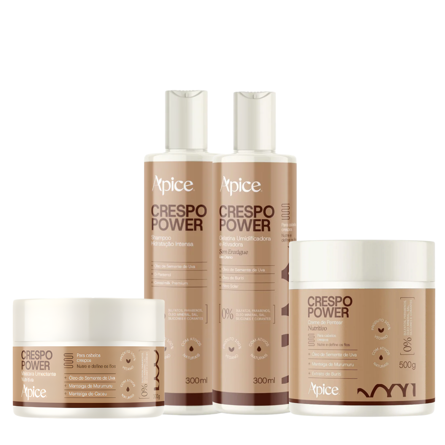 O Kit Crespo Power da Apice Cosméticos oferece cuidado completo, combinando hidratação profunda, nutrição intensa e finalização perfeita para cachos tipo 4, crespos e em transição. Ideal para uso diário, livre de sulfatos, parabenos, silicones e óleo mineral.