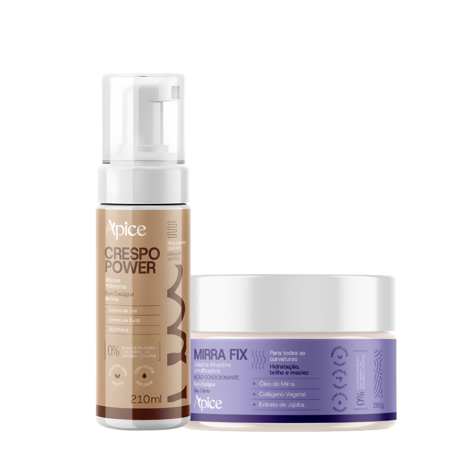 gelatina mirra fix – mousse crespo power – duo finalização cachos – definição de cachos – hidratação para cachos – day after – controle de frizz – finalizador de cachos – cabelo cacheado – cabelo crespo – finalização capilar – apice cosméticos – kit para cachos – cachos hidratados – creme de pentear – mousse para cachos – gelatina para cachos