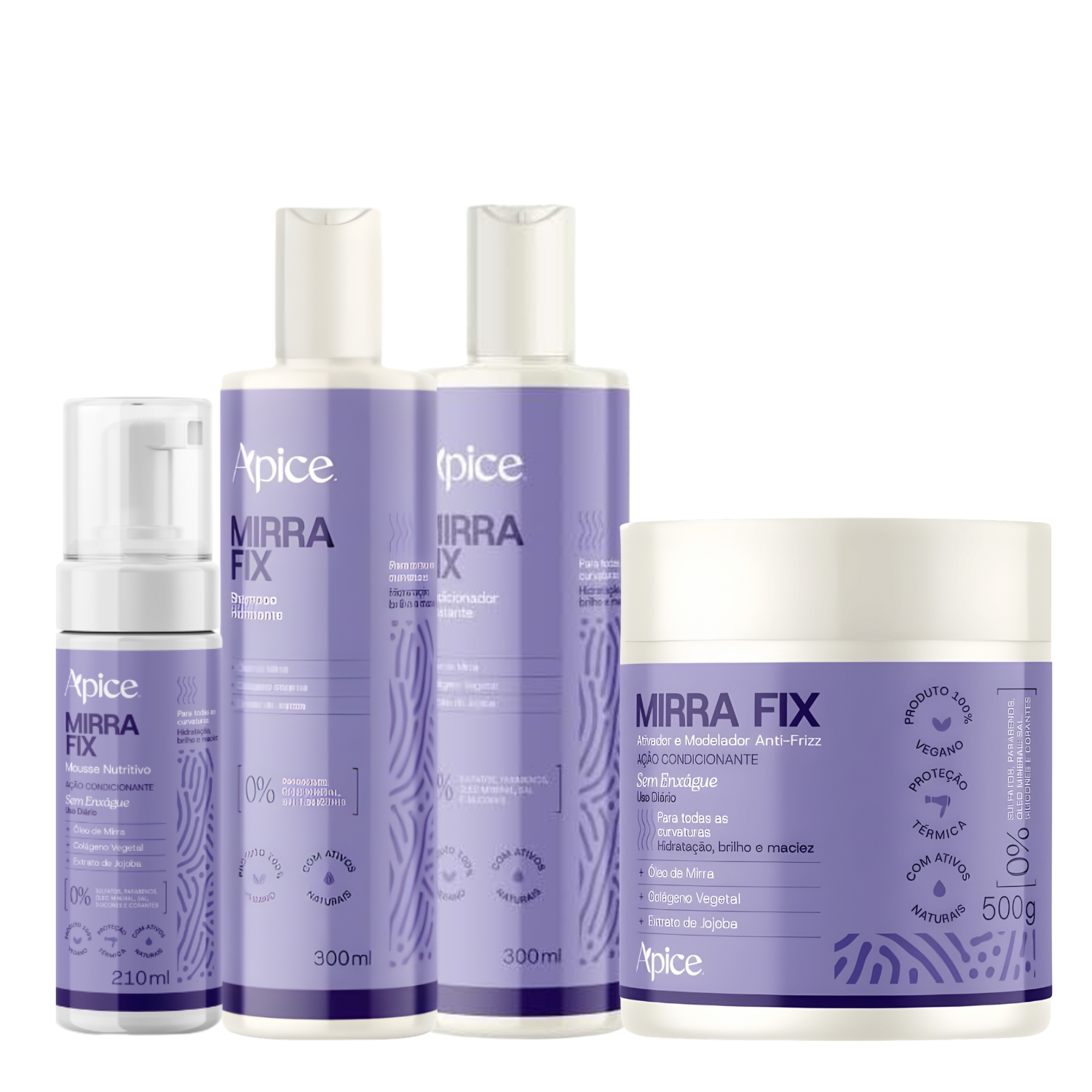 O Kit Mirra Fix da Apice Cosméticos foi desenvolvido para quem deseja cabelos cacheados, crespos ou ondulados com definição duradoura, hidratação intensa e brilho natural. Cada produto da linha age em sinergia, proporcionando cuidado completo desde a lavagem até a finalização.