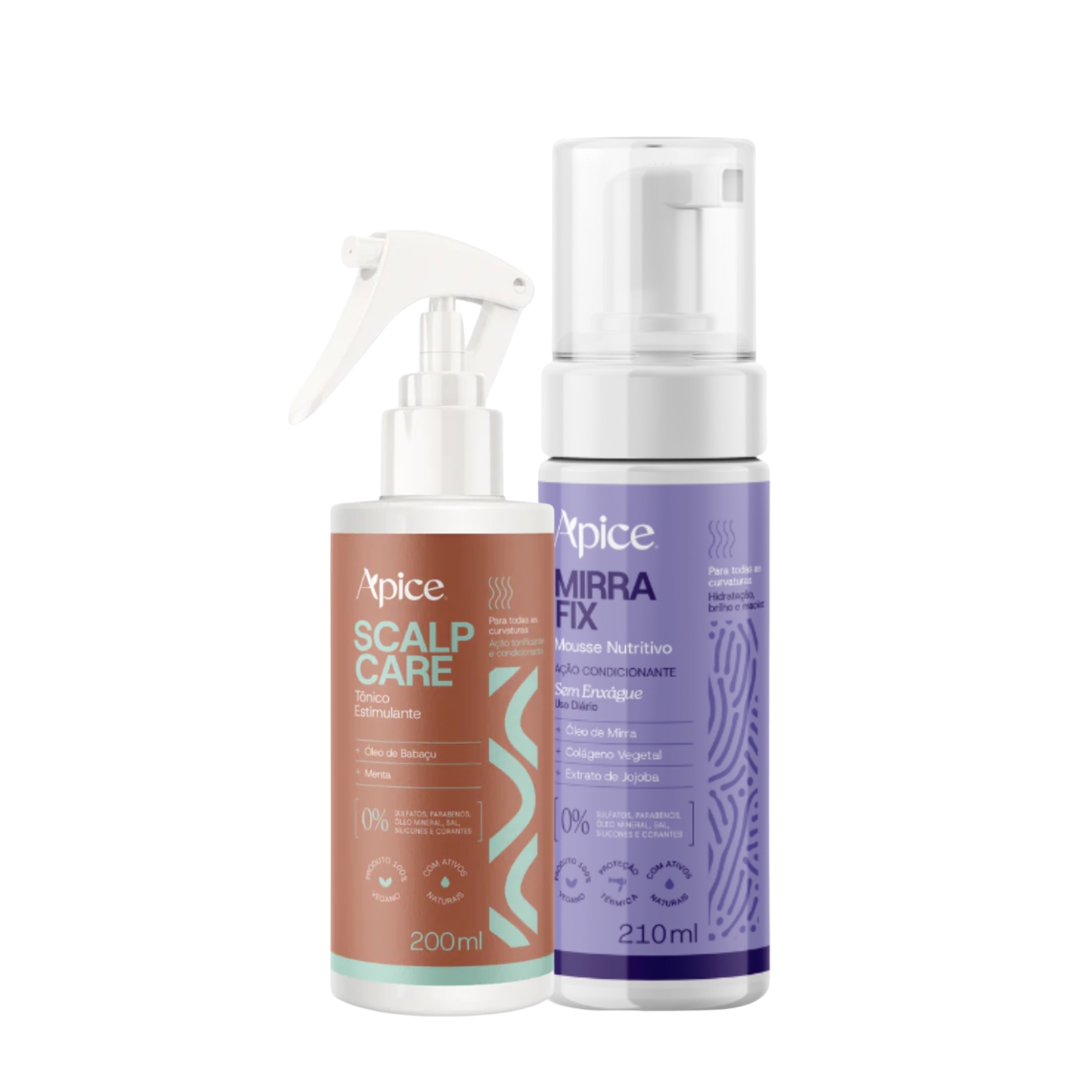 O Kit Apice Scalp & Mirrafix é a combinação perfeita para quem busca fios mais fortes desde a raiz e cachos definidos da raiz às pontas.